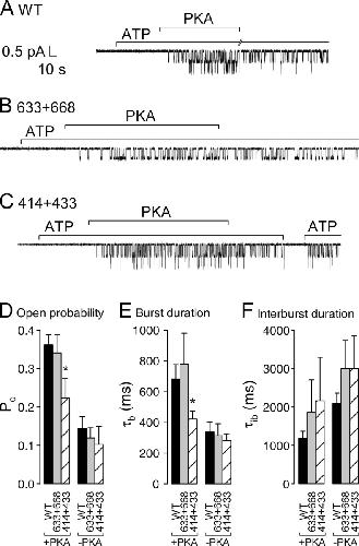 Figure 4. . Single-channel kinetics in the presence of PKA and following its removal. Patches containing (A) two WT, (B) a single 633+668, or (C) two 414+433 channels were superfused with 2 mM MgATP; after ∼1 min 300 nM PKA catalytic subunit was transiently added (bars). Note absence of openings during exposure to ATP alone, before addition of PKA. (D) Open probabilities, (E) mean burst (τb), and (F) interburst durations (τib), in the presence of PKA+ATP (left) or in just ATP after PKA removal (right), extracted from multichannel patches (materials and methods). Po and τb values in PKA are given in the text; τib in PKA was 1190 ± 177 ms (n = 11) for WT, 1861 ± 850 ms (n = 5) for 633+668, and 2165 ± 1136 ms (n = 6) for 414+433. After PKA removal, Po was 0.14 ± 0.03 (n = 7), 0.12 ± 0.03 (n = 4), and 0.10 ± 0.05 (n = 5); τb was 339 ± 64 ms (n = 8), 314 ± 77 ms (n = 6), and 282 ± 44 ms (n = 10); and τib was 2090 ± 268 ms (n = 7), 3004 ± 736 ms (n = 4), and 3005 ± 847 ms (n = 5) for WT, 633+668, and 414+433, respectively. Asterisks in D and E indicate significantly smaller Po (P = 0.017) and significantly shorter bursts (P = 0.03), respectively, for 414+433 compared with WT.