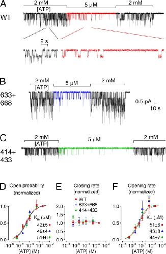 Figure 5. . ATP dependence of single-channel gating kinetics is intact for severed CFTR constructs. Currents from patches with few active (A) WT, (B) 633+668, and (C) 414+433 channels exposed to 5 μM MgATP, bracketed by superfusion with 2 mM MgATP (bars). Note prolonged closed (interburst) periods in 5 μM ATP, evident in the inset with expanded time scale in A. (D–F) Mean burst (τb) and interburst (τib) durations were extracted (materials and methods) from segments of record in various [ATP], and closing and opening rates defined as 1/τb and 1/τib. Po (D), closing (E) and opening rates (F) in test [ATP], normalized to the average of the same parameters in the bracketing control segments, are plotted against [ATP]. Curves show fits of Po (D) and opening rate (F) to the Michaelis-Menten equation, giving Km values printed.