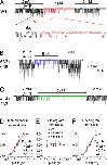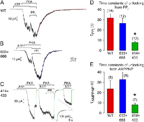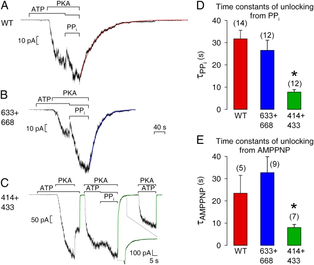 Figure 6. . Relaxation of macroscopic current upon removal of PPi+ATP or AMPPNP+ATP is faster for severed 414+433 channels. Macropatches expressing hundreds of (A) WT, (B) 633+668, or (C) 414+433 channels were superfused with either 2 mM or 0.1 mM (together with PPi) MgATP, 300 nM PKA catalytic subunit, and 2 mM Mg-PPi, as indicated by bars; the 40-s time bar applies to all three panels A–C. In A and B, smooth lines through data are single-exponential fits, τ = 56 s for WT (A), τ = 30 s for 633+668 (B). In C, all three instances of current decay were fitted (smooth green lines); first and third relaxations were fit with single exponentials yielding τ = 422 ms and τ = 353 ms, respectively; the relaxation following PPi removal was fit with two exponentials yielding time constants and fractional amplitudes of τ1 = 400 ms, τ2 = 6.5 s, a1 = 0.56, a2 = 0.44. (D) Average τ for WT and 633+668 from single-exponential fits, and τ2 for 414+433 from double-exponential fits, to decaying currents after removal of PPi+ATP. (E) Average τ2 for WT, 633+668, and 414+433 from double-exponential fits to decaying currents after removal of AMPPNP+ATP. Asterisks indicate significantly shorter slow time constants for 414+433 compared with WT, in D (P = 10−5) and in E (P = 0.049).