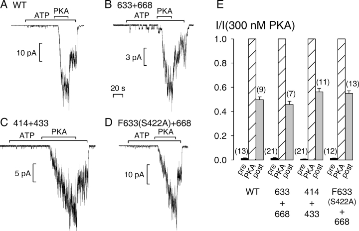 Figure 2. . Obligatory dependence on phosphorylation by PKA of macroscopic currents of severed CFTR constructs. Macropatches containing tens or hundreds of (A) WT, (B) 633+668, (C) 414+433, or (D) F633(S422A)+668 (with NH2-terminal Flag tag), channels were superfused with 2 mM MgATP and, after ∼1 min, transiently with 300 nM PKA catalytic subunit (bars); the 20-s time bar applies to all four panels A–D, which show recordings obtained at −80 mV. (E) Mean currents in MgATP alone, before (pre, black bars) or after (post, gray bars) exposure to PKA, normalized to the mean of the steady current in the presence of PKA (PKA, striped bars). Neither pre-PKA (P > 0.32) nor post-PKA (P > 0.11) currents were significantly different from those of WT for any of the three severed constructs.