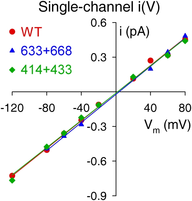 Figure 7. . Single-channel conductance is unaltered in severed-NBD1 constructs. Representative examples of single-channel current–voltage (I–V) relationships in symmetrical 140 mM Cl− for WT, 633+668, and 414+433 CFTR channels. Slopes of straight lines fitted by linear regression yield single-channel conductances; mean values are given in the text.