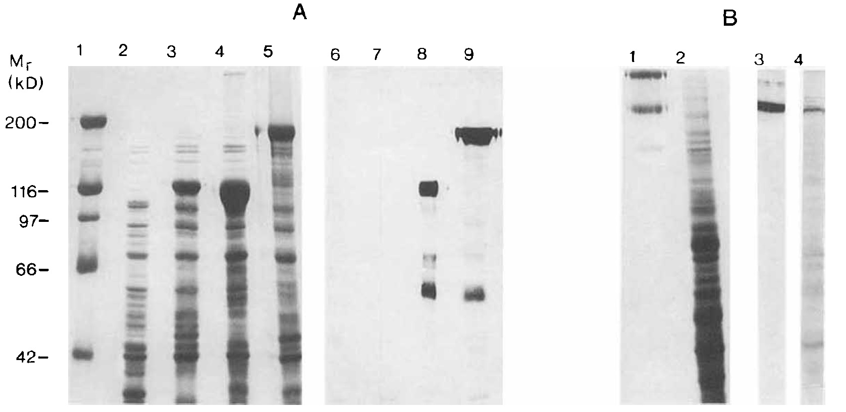 (lanes 2-5) and immunoblot (lanes 6-9), showing total protein from induced bacteria containing the unfused trpE gene (lanes 2, 6),