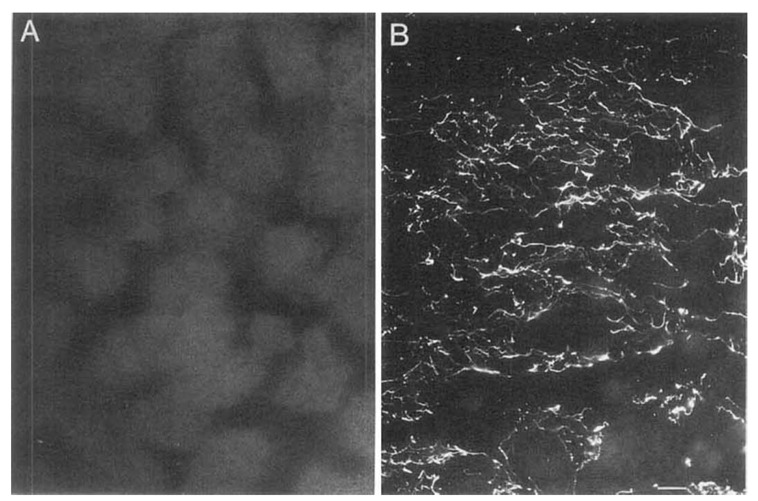 Fig. 3A, B. Tissue-specific distribution of laminin in muscle and kidney. Indirect immunofluorescence staining for laminin in 10-pm