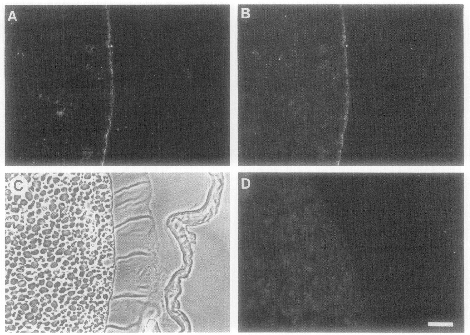 shows the corresponding phase-contrast image; panel D shows a similar section treated with nonimmune serum. Bar = 28 pm.