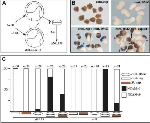 (A) Ectoderm explants were taken at stage 10.25 or 11 from embryos that were treated (or not) with 80 μM SU5402. Animal caps were then washed and recombined with control organiser mesoderm explants prepared at the same stage. Conjugates were further cultured for 24 hours and analysed by immunostaining for NCAM expression.