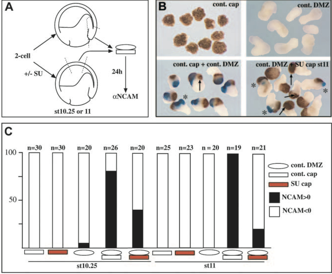 (B) Typical results obtained in such assays. NCAM expression is in blue pointed by asterisks, arrows indicate cement glands. Conjugates made with stage 11 SU5402-treated animal caps show either no NCAM signal (counted as negative) or dramatically reduced NCAM signal (counted as positive). Furthermore, these conjugates retain cement gland tissue despite the lack of neural tissue. (C) Bar graph presenting the results as the percentage of NCAM-positive conjugates over the total number of conjugates in each condition. Pre- treatment with the FGFR inhibitor considerably reduces the number of conjugates showing neuralisation. |