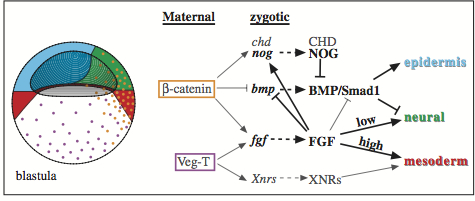 Fig. 9. A model for neural induction in Xenopus. See text for explanations. Coloured domains indicate prospective tissues. Orange and purple dots indicate β-catenin and VegT protein distribution in blastula nuclei, respectively. Arrows are not intended to represent direct regulation. The goal of this figure is to try and represent how the major molecular pathways known to impact on early embryonic patterning are integrated. It is not meant to give a complete view of this process. Regulatory arrows shown in black are inferred in part or totally from our work, while those shown in grey originate from other studies. Neural specification requires concomitant BMP inhibition, and low FGF signalling acting in a BMP-independent manner. |