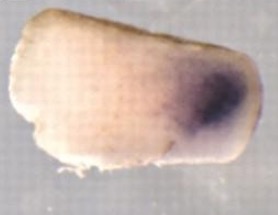 dkk1 (dickkopf WNT signaling pathway inhibitor 1) gene expression in bisected Xenopus laevis embryo, mid-sagittal section, assayed via in situ hybridization, NF stage 10.5, dorsal right, animal hemisphere up. |