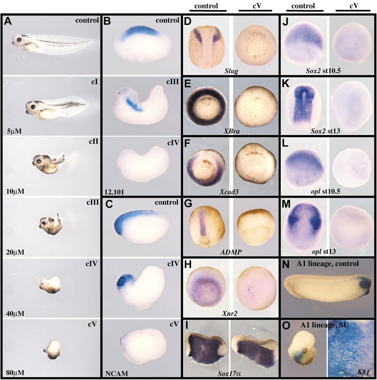 Fig. 3. FGFR signalling is required for neural induction. (A) Four-cell embryos were treated until fixation with various concentrations of SU5402, as indicated. Phenotypic classes were defined according to the severity of axial deficiencies. Class V embryos lacked muscle, NCAM-positive neural tissue and neural crests [as revealed by 12.101 (B) and 4d (C) immunostaining at tailbud stage, or by Slug RNA hybridisation at neurula stage (D)]. Class V embryos at gastrula stages lacked prospective posterior and axial mesoderm (XBra, Xcad3, ADMP; E-G), prospective haematopoietic mesoderm (Xnr2, H), but contained prospective endodermal tissue (sox17α, I). (J-M) Sox2 (J,K) and opl (L,M) expression are shown at early (J,L) or late (K,M) gastrula stages in control and class V embryos. No neural precursors are present in class V embryos. (N,O) Thirty-two-cell embryos were injected with 250 pg lacZ RNA in one A1 blastomere (animal-most, dorsal-most). In untreated controls, injected cells populate mostly the eye and the brain and some head epidermis (N). In the presence of 120 μM SU5402, embryos were class V, and the injected cells were now found entirely in the epidermis below the cement gland (O). These cells expressed the marker K81, indicating that prospective neural cells were converted into epidermal progenitors in absence of FGF activity. SU5402 is not toxic to ectoderm cells as they remain alive, and expressβ -galactosidase and K81. (A-C) Lateral view, anterior towards the left. (N) Lateral view, anterior towards the right. (D,G,J-M) Dorsal view, anterior towards the top. In M, the embryo is slightly tilted upwards. (E,F,H) Vegetal view, dorsal towards the top. (I) Hemisectioned embryo, dorsal towards the right. O, frontal view. |