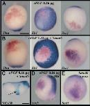 Fig. 7. Organiser gene expression in FGFR-deficient embryos. (A-H) Four-cell embryos were treated with 80 μM SU5402 until early gastrula stage 10.5 and fixed for in situ hybridisation. This treatment yielded class V embryos. In A-C, embryos were cut in two halves along the dorsoventral midline prior to hybridisation in order to improve probe penetration. The organiser genes cerberus (cerb; A), dickkopf1 (dkk1, B), hex (C), otx2 (D), goosecoid (gsc; E) and chordin (chd; F) are normally expressed in class V embryos, whereas noggin (nog; G) is not. Conversely, the epidermis inducer bmp4 is ectopically expressed in the dorsal ectoderm of class V embryos (H). Thus, BMP signalling is probably upregulated in prospective neural tissue in absence of FGF activity. (A-C) Dorsal towards the right. (D-G) Vegetal view, dorsal towards the top. (H) Dorsal view, anterior towards the top, broken lines indicate the blastopore. |