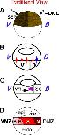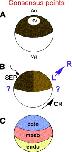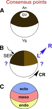 Fig. 1. (A) Consensus points between the traditional and revised views of amphibian axial patterning. Both views concur that the egg (A) is radially symmetric about its animal/vegetal (An/Vg) axis, and that (B) fertilization establishes two axes, by initiating cortical rotation (CR). The sperm entry point (SEP) organizes the cytoskeleton for the rotation, which results in the animal hemisphere being lightly colored on the side opposite the SEP after CR. The SEP serves as one pole of an axis and on the opposite side of the embryo, organizers and signaling centers will form later in development. This axis is disputed by the two views. In the traditional view, it is the ventral-to-dorsal axis but in the revised view, it is the caudal-to-rostral axis. The second axis established by CR is the left/right (L/R) axis. The left side of the embryo is shown in all panels. (C) Both views agree on the arrangement of the germ layers. Ectoderm (blue) maps to the animal region, mesoderm (red) maps to the equatorial region and endoderm (yellow) maps to the vegetal region. |