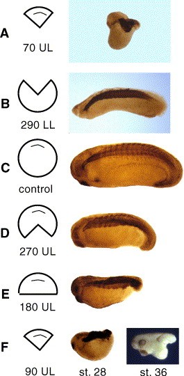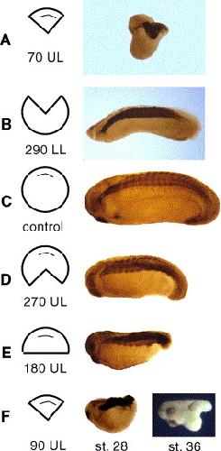 Fig. 4. The prime meridian is specified to form the head. Embryos were dissected at st. 8 into fragments from the animal pole to the vegetal pole that either include or exclude the prime meridian. The fragments were cultured to approximately st. 28, unless otherwise specified, and immunostained for notochord and somites, except for the final image in panel F, which shows an unstained fragment at control st. 36. The fragments are diagrammed from a vegetal pole view. All fragments that include the prime meridian form a head and those that exclude the prime meridian do not. (A) A 70fragment (70 UL) centered on the prime meridian forms a head with notochord and somites, while the corresponding 290fragment without a prime meridian forms a properly patterned trunk/tail body plan without a head. (C) In a second experiment, embryos were cut along symmetrical meridians at decreasing distance from the prime meridian. The resulting body plans show that both dorsal and ventral tissues are truncated, and that the closer cuts are made to the sperm entry meridian, the more caudally complete is the body plan. In panel F, the head that forms from the 90upper lip fragment is shown at st. 28 and 36. The head is fairly complete but is missing the gill pouches. Abbreviations: LL, lower lip; UL, upper lip. |