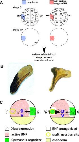 Fig. 7. Reinterpretation of the role of organizer-derived BMP antagonists and Spemann and Mangold's grafting experiment. (A) Experimental design for lineage tracing the fate of normal and noggin-expressing C4 blastomere progeny. (B) St. 6 embryos were injected with lineage tracer (black cells, embryo on left) or tracer plus noggin mRNA (black cells, embryo on right) into one C4 blastomere and cultured to st. 280. Normal C4 progeny populate caudal structures, both dorsal (somites) and ventral, much of which will end up in the tail of the tadpole by st. 41. C4 progeny expressing noggin ectopically form a secondary axis and contribute to both dorsal and ventral tissues. However, labeled cells form rostral levels of the secondary axis and continue into the tail, because of mediolateral intercalation. The presence of cells at rostral positions of the secondary axis indicates that cells have been incorporated into axial structures precociously, and hence are ostralizedrather than orsalized (C) Formation of an ectopic, secondary axis following an organizer-derived graft. C4 progeny exposed to an organizer graft form axial structures precociously, and start a second site of mediolateral intercalation (Lane et al., 2004). Thus, two sets of trunk structures are initiated and merge into a single tail, but only the endogenous axis forms a head. |
