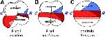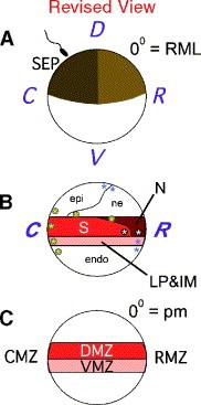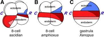 Fig. 8. Three chordate fate maps. In the ascidian fate map (A), and the amphioxus fate map (B), the R/C axis runs across the equator from the notochord field (brick red) to the muscle/somite field (red). Ventral mesoderm in shown in pink, and neural tissue is shown in blue. In the Xenopus fate map (C), this dimension has historically been called D/V, but new mapping data indicates it is the previously unassigned R/C axis. Similarities in the three maps are discussed in the text. |