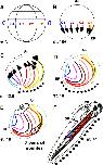 Fig. 6. Re-analysis of Keller's gastrula-to-tailbud fate map demonstrates a rostral-to-caudal progression running from the prime meridian to the sperm entry point. The pertinent blastomeres, C14, are indicated in different colors on the diagram of a st. 6 embryo in A. C1 is orange; C2 is red; C3 is purple and C4 is blue. These four blastomeres form much of the marginal zone of an early gastrula, the stage mapped by Keller. In panel B, the lines of cells Keller marked are indicated by arrows of different shades of the four colors used for the st. 6 embryo in panel A, except that the grey, yellow and orange lines all descend primarily from blastomere C1. The polarity of the marked lines of cell is indicated by the arrows. The arrowheads mark the prospective ventral mesoderm, which crawls along the roof of the blastocoel before differentiating as ventral mesoderm. In panel C, the emerging dorsal midline, which forms as the blastopore (bp) closes over the yolk plug, is indicated by a dotted line. The blastopore has crossed the vegetal pole but remains open. Large dotted and dashed lines indicate the emerging dorsal and ventral midlines of the body plan, respectively. In panel D, the blastopore has closed near the former lower lip and the dorsal midline, indicated by the dotted line, is much longer than the ventral midline because dorsal mesoderm and neural tissues are elongating due to strong convergence extension movements. The arrowheads in the ventral mesoderm are deleted to simplify the diagrams. In panel E, the contributions from the marginal zone to the ventral blood islands (vbi) are arranged in a rostral-to-caudal progression from the C1-to-C4 blastomeres. The approximate position of the first 3 head somites is shown. They descend from cells derived from blastomeres C1 and C2. The formation of somites is complex and the diagram is meant to indicate only rostral/caudal contributions, not dorsal/ventral somite origins. In panel F, the rostral/caudal contributions from the four C blastomeres are shown in the somites of a st. 41 tadpole. Cells from the marginal zone contribute to somites in a rostral-to-caudal progression that corresponds to the order C1, C2, C3 and finally C4. See text for further explanation. |