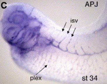 At stage 35, APJ transcripts are detected throughout the developing vasculature, including the assembling vascular plexus in ventrolateral regions of the embryo and distinctly in the intersegmental vessels.