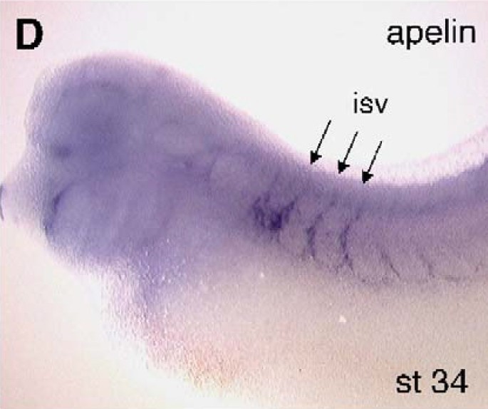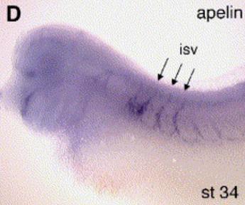 assembling vascular plexus in ventrolateral regions of the embryo and distinctly in the intersegmental vessels. (D) At stage 35, apelin expression is visible in the