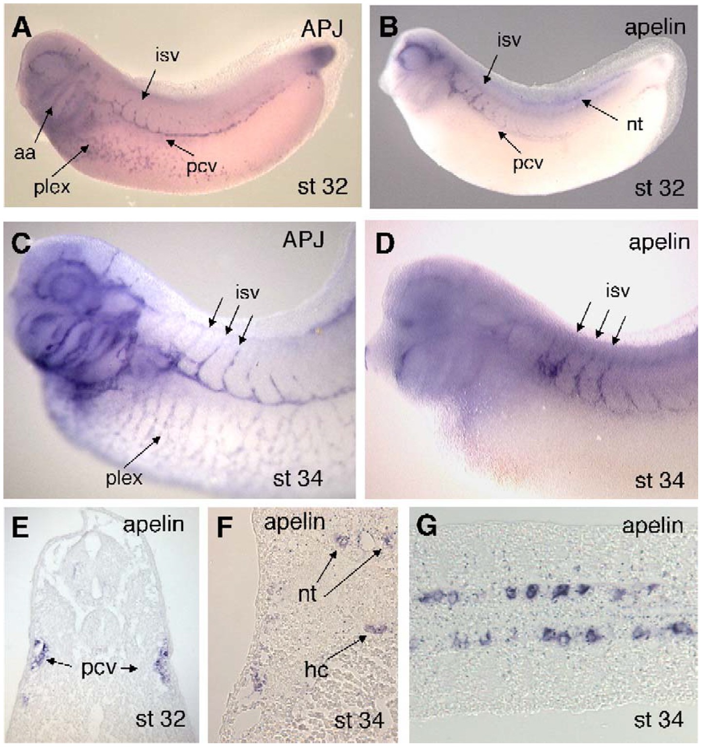 ventral neural tube (nt). (G) Longitudinal section through ventral neural tube of stage 34 embryo stained for apelin. Anterior is to the left. Note that expression is not