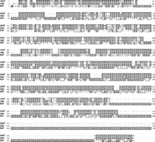 Figure 1. Amino acid sequence alignment of Xenopus, human and yeast Hsl7 proteins. The amino acid sequences of Hsl7 orthologs were aligned using the ClustalW alignment parameters in the program MacVector. Dark shading indicates identities and light shading indicates similarities.