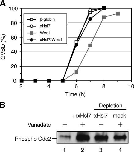 Figure 5. Excess xHsl7 restores inhibition of oocyte maturation induced by Wee1 injection and xHsl7 does not affect Wee1 kinase activity. (A) 50 stage VI oocytes were injected with 40 ng of mRNAs encoding β-globin (open square), FLAG-xHsl7 (open circle), HA-Wee1 (closed square), and 40 ng each of FLAG-xHsl7 and HA-Wee1 mRNAs together (closed circle). After a 12-h incubation, they were treated with progesterone and scored for the percentage of GVBD. (B) Ultra S Xenopus egg extract (purified cytosol) was either mock depleted, depleted of xHsl7, or supplemented with recombinant xHsl7. ATP-regenerating system was then added along with sodium vanadate to inhibit dephosphorylation of Cdc2. Recombinant human cyclin B1 was then added and the reaction was allowed to proceed for 10 min. xWee1 activity was determined by assaying the phosphorylation level of Cdc2 by immunoblotting with anti-phospo Cdc2.