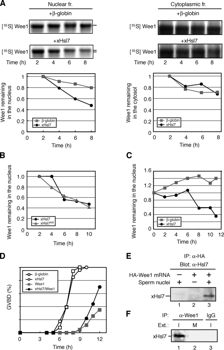 Figure 6. Hsl7 promotes intranuclear Wee1 degradation. (A) Xenopus stage VI oocytes were injected with 40 ng of β-globin or FLAG-xHsl7 mRNAs and incubated in the presence of 50 μM roscovitine. 12 h later, they were injected again with 35S-labeled Wee1 protein. After the second injection, they were treated with progesterone (1 μM) and roscovitine in modified Barth's + Ca buffer. At the indicated times after treatment, five oocytes were manually dissected into nuclear (left) and cytoplasmic (right) fractions, and analyzed by SDS-PAGE and autoradiography. The graph represents a quantitation of the data above showing the fraction of Wee1 remaining in nuclei or cytosol. Square, β-globin; circle, FLAG-xHsl7 mRNA injection. The bars to the left of the panel denote the mobility shift of Wee1. (B) 40 ng mRNAs of FLAG-xHsl7 (circle) and FLAG-xHsl7 metyltransferase mutant (triangle) were injected into oocytes. The Wee1 degradation assay was performed as described in panel A. The graph shows the fraction of Wee1 remaining in nuclei. (C) Oocytes were injected as in panel A, but after the second injection, they were treated with leptomycin B (200 nM) for 2 h. Progesterone (1 μM) was then added to induce oocyte maturation. At the indicated times after progesterone treatment, five oocytes were manually fractionated and analyzed by SDS-PAGE followed by autoradiography. The graph shows the fraction of Wee1 remaining in nuclei. Square, β-globin; circle, FLAG-xHsl7 mRNA injection. (D) The experiment in Fig. 5 A was repeated as described except that MG132 was injected into the oocytes along with the indicated mRNAs. Open square, β-globin; open circle, FLAG-xHsl7; closed square, HA-Wee1 mRNA injection; closed circle, FLAG-xHsl7 and HA-Wee1 mRNAs coinjection. (E) Buffer (lane 1) or HA-Wee1 mRNA (lanes 2 and 3) were incubated in cycling extracts in the presence (lanes 1 and 3) or absence (lane 2) of sperm chromatin. After 60 min, HA-Wee1 protein was isolated with anti-HA beads and bound proteins were analyzed by anti-Hsl7 immunoblotting. (F) Interphase (lanes 1 and 3) or mitotic (lane 2) egg extracts were incubated in the presence of sperm chromatin for 60 min, and immunoprecipitated with anti-Wee1 antibody (lanes 1 and 2) or control antibody (lane 3) bound to protein A–Sepharose beads. Immunoprecipitates were then blotted with anti-Hsl7 antibodies.