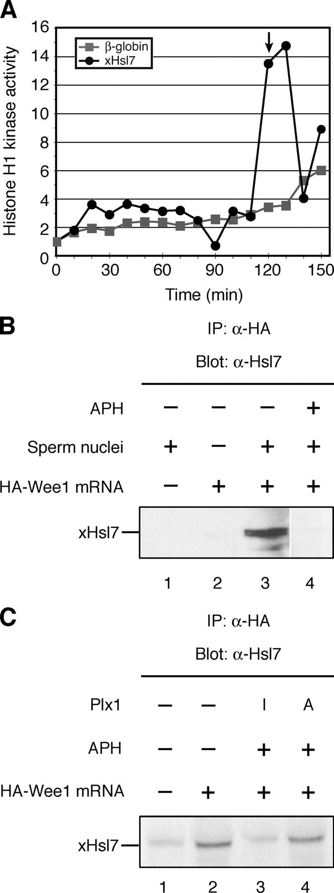 Figure 7. Excess Hsl7 overrides the DNA replication checkpoint. (A) Xenopus Hsl7 or β-globin mRNA was incubated in cycling extracts in the presence of aphidicolin (200 μg/ml). Cell cycle progression was monitored by assessing histone H1 kinase activity. Square, β-globin mRNA; circle, FLAG-xHsl7 mRNA. An arrow indicates the time of the nuclear envelope break down and the chromosome condensation as monitored by a microscope. (B) Buffer (lane 1) or HA-Wee1 mRNA (lanes 2,3, 4) were incubated in cycling extracts containing no sperm (lane 2) or sperm chromatin DNA (lanes 1, 3, and 4) in the absence (lanes 1–3) or presence (lane 4) of aphidicolin (200 μg/ml). After a 60-min incubation, HA-Wee1 protein was isolated with anti-HA beads and bound proteins were analyzed by anti-Hsl7 immunoblotting. (C) Buffer (lane 1) or HA-Wee1 mRNA (lanes 2–4) were incubated in cycling extracts containing sperm chromatin DNA in the absence (lanes 1 and 2) or presence (lanes 3 and 4) of aphidicolin (200 μg/ml) and inactive Plx1 (lane 3) or constitutively active Plx1 (T201D; lane 4). After a 60-min incubation, HA-Wee1 protein was isolated with anti-HA beads and bound proteins were analyzed by anti-Hsl7 immunoblotting.