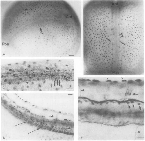 structures (arrowheads) are also visible. In a parasagittal optical section of an anti-acetylated tubulin-stained stage 23 embryo(C), both lateral
