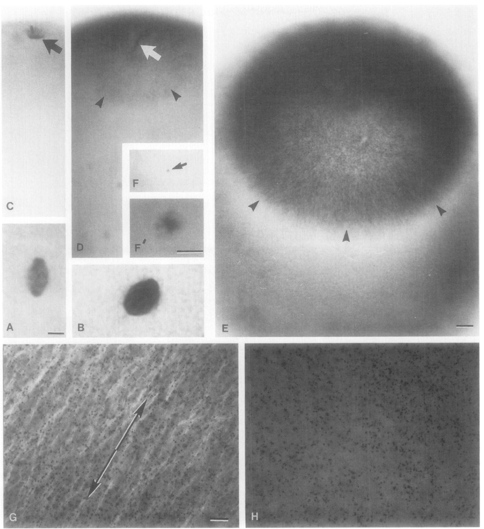 (arrowheads). Bar in A marks 80 km for A and B; the bars in C-E mark 30 pm. |
