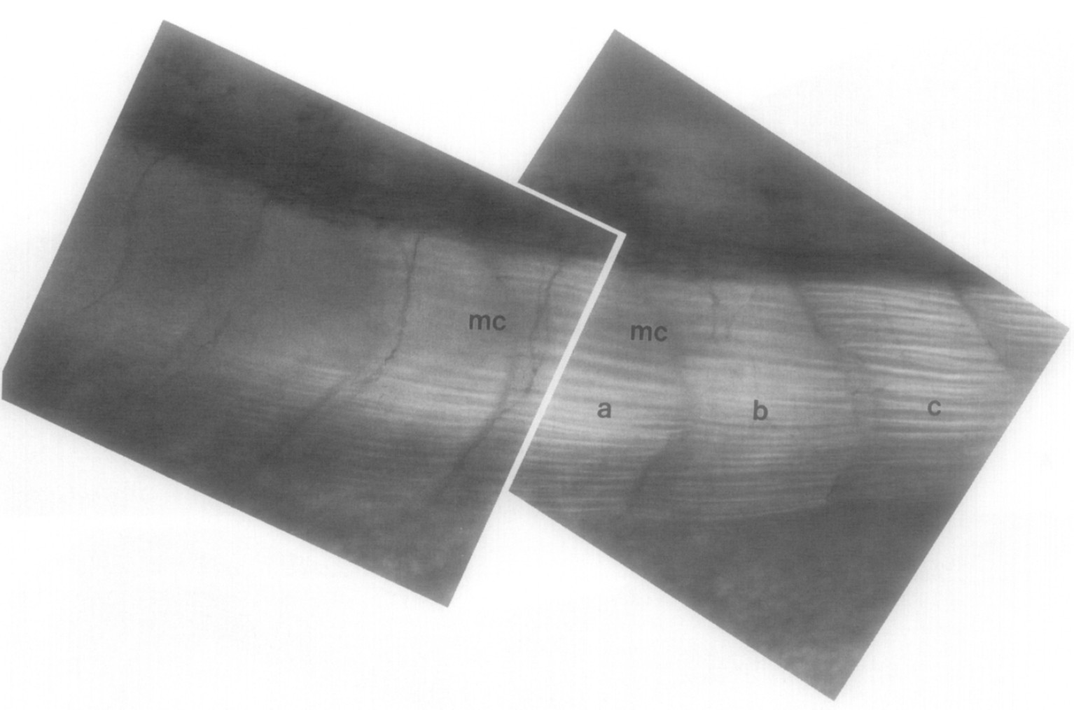 8C. It is clear that the motoneurites do not run down the intermytomal boundary (the myocommata, marked mc) but rather emerge from the