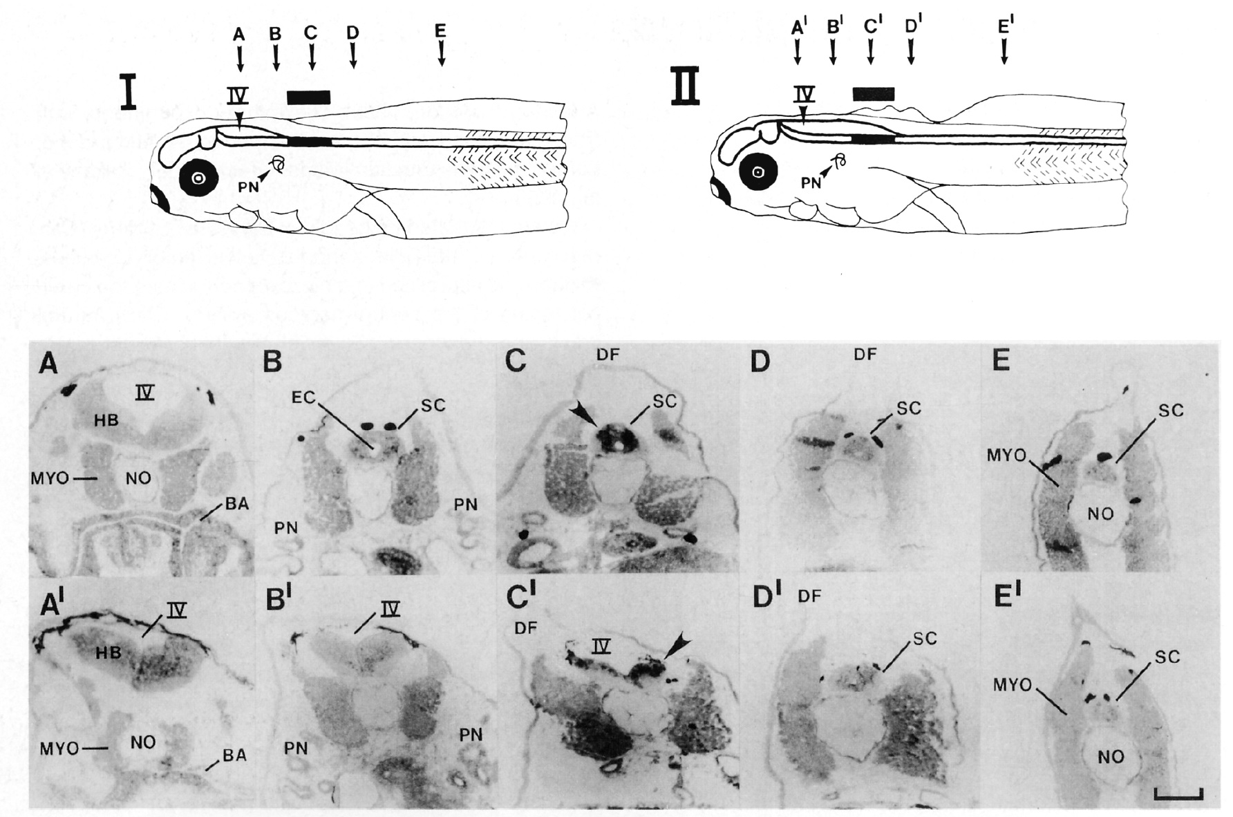 tadpoles (I) it occupies spinal cord, but in the antibody-injected tadpole (II) it lies in a hindbrain-like structure complete with expanded fourth ventricle.