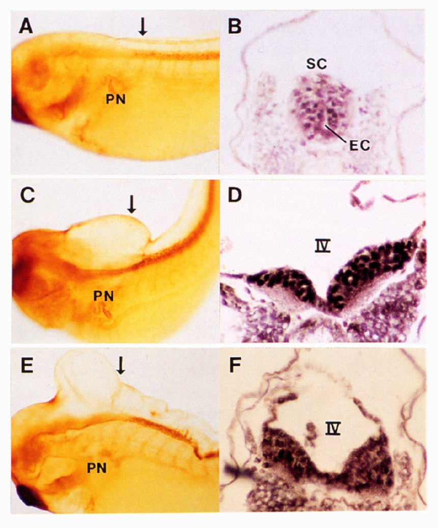 XlHbox 1 protein is indicated by an arrowhead in (B) and (Bâ). Abbreviations: EC, ependymal canal; HB, hindbrain; IV, hindbrain cavity called the