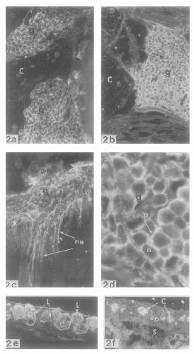FIG. 2e. Bright fluorescence to B-EP antisera is localized in the Leydig cells (L) of the larval skin