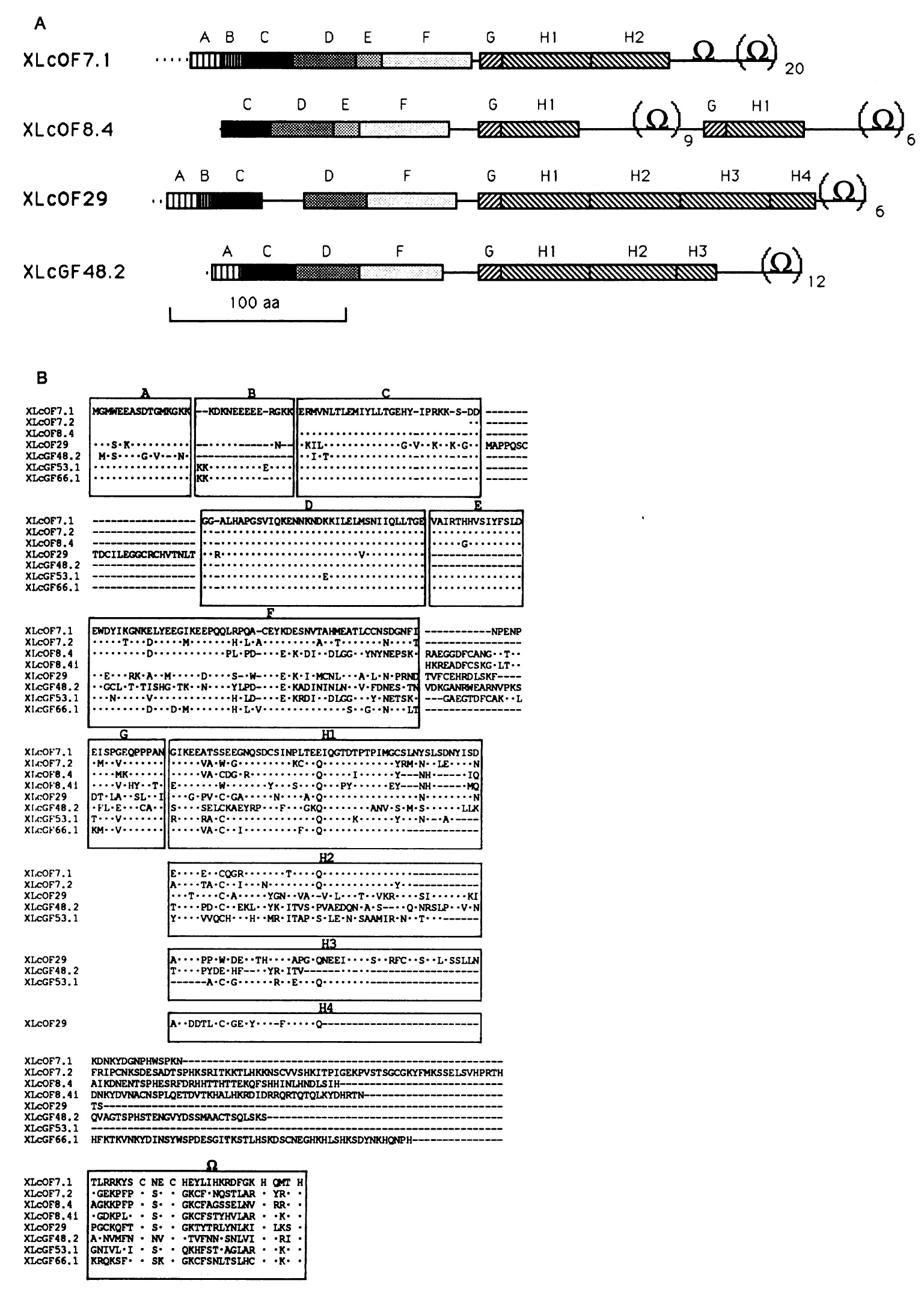 Many DNA-binding proteins that are involved in the differential regulation of gene expression are composed of multiple discrete modules. Association of the homeobox-encoded helix-turn-helix DNA-binding motif with conserved modules, such as the paired box or the POU domain, has led to the definition of structurally and functionally related subfamilies of regulatory proteins. The zinc finger, which is the second major nucleic acid-binding motif characterized to date, defines large multigene families in higher eukaryotes; we have isolated more than 100 Xenopus finger protein-encoding cDNAs and in this study we show that at least 10 of these clones share extensive sequence homologies in a region of more than 200 amino acids in the N-terminal nonfinger portion of the predicted proteins, which is connected to variable finger clusters. We refer to this element as a finger-associated boxes (FAX) domain. Cross-hybridization with human genomic DNA indicates that the finger-associated boxes domain is evolutionary conserved. Northern blot analysis shows that the corresponding genes are differentially expressed in the course of early Xenopus embryogenesis.