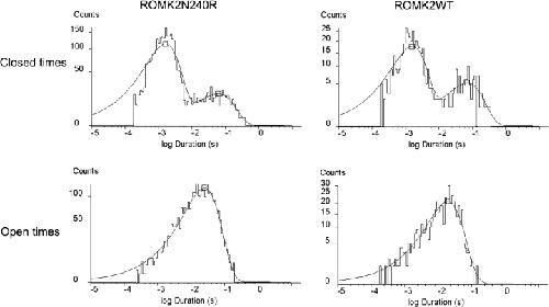 Figure 4. . Kinetic properties of ROMK2 and ROMK2N240R. Currents were recorded from cell-attached patches containing only one channel at a cell potential of −100 mV. Above, closed-time histograms were fit with two exponentials. For ROMK2, the exponentials had time constants of 1.5 ms (77% of closures) and 70 ms (23%). For ROMK2N240R, the exponentials had time constants of 1.7 ms (87%) and 61 ms (13%). Below, open-time histograms were fit with one exponential distribution. Time constants were 20 ms for ROMK2 and 25 ms for N240R. |