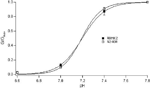 Figure 6. . pH-dependence of macroscopic currents. Oocytes were bathed in solutions containing 55 mM Kacetate. The pH of the extracellular solution was reduced in steps, and the currents were measured after a new steady-state was achieved in 10–15 min. Inward conductance was normalized to maximal values measured at pH 7.8. Data points represent means ± SEM for four oocytes. Solid lines represent best fits to a Hill equation with pKa = 7.20 and n = 4.1 (ROMK) and pKa = 7.19 and n = 4.9 (N240R). |