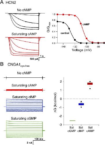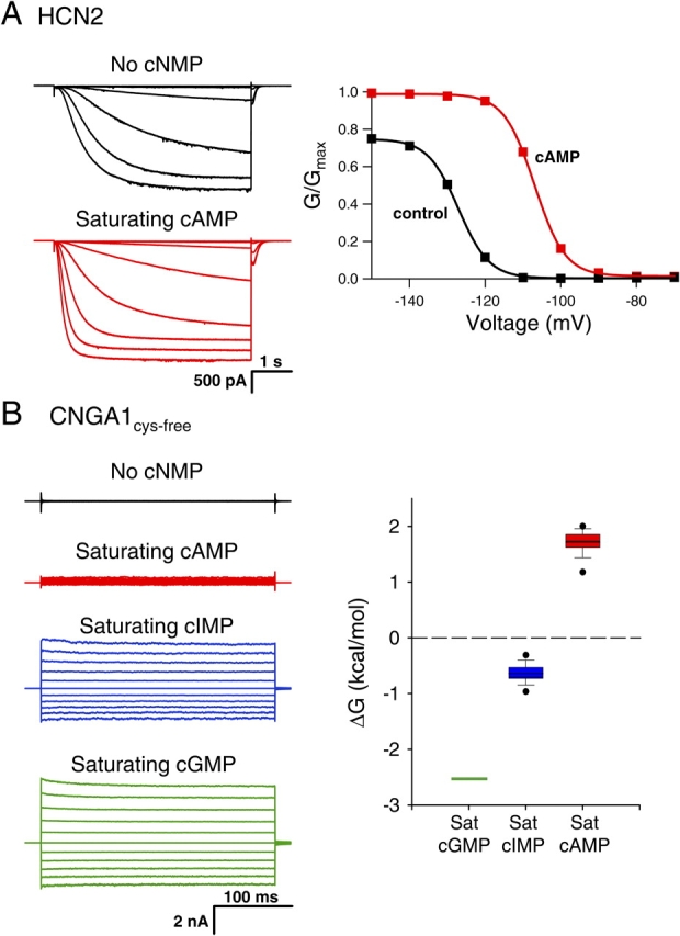 Figure 2. . Behavior of wild-type HCN2 and CNGA1cys-free channels. (A) Behavior of wild-type HCN2 channels. Currents (left) and conductance–voltage relations (right) are shown in the absence (black) and presence of saturating cAMP (red). The currents were recorded in response to voltage pulses from a holding potential of 0 mV to test potentials between −70 and −150 mV, returning to a tail potential of −40 mV, and the conductance–voltage relations were obtained from normalized tail currents. (B) Behavior of CNGA1cys-free channels. Leak-subtracted currents (left) in response to voltage pulses from a holding potential of 0 mV to test potentials from −100 to +100 mV are shown in the absence (black, not leak subtracted) and presence of saturating cAMP (red), cIMP (blue), and cGMP (green). Box plot (right) of the ΔG for the opening transition with bound cGMP, cIMP, and cAMP. Center line is the median of the data, box is the 25th to 75th percentile of the data, and whiskers are the 5th and 95th percentile of the data. Outliers are shown as symbols. |