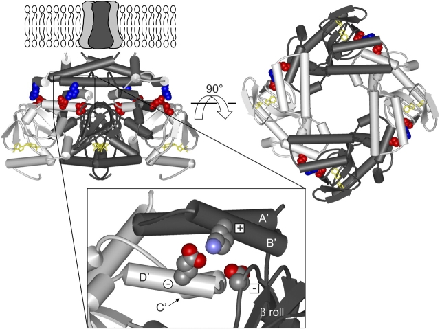 Figure 1. . Structure of HCN2 C-linker and CNBD. Structure of the HCN2 COOH-terminal region (Zagotta et al., 2003), viewed from the side (left) and from the membrane (right). The structure is positioned below the membrane-spanning portion of the channel, as it is thought to be in vivo. The structure contains four subunits, two in dark gray and two in light gray, with the C-linkers making up the top half of the structure and the CNBDs the bottom half. cAMP (yellow) is bound in the CNBD of each subunit. Residues of the putative salt bridges are shown in CPK format: K472 (blue), E502 and D542 (both in red). Enlargement of the region with these salt bridges (inset). Only two subunits are shown here, with the A'–D' helices and β roll labeled, and the residues are now colored according to their elements (carbon, gray; nitrogen, blue; and oxygen, red). Plus sign within a square is K472, minus sign within a square is D542 from the same subunit, and minus sign within a circle is E502 from the neighboring subunit. |