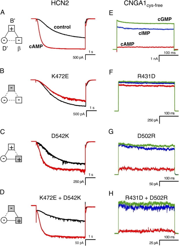 Figure 5. . Mutations of intrasubunit salt bridge. (A–D) Behavior of wild-type HCN2 (A), K472E (B), D542K (C), and K472E + D542K (D) channels. Currents in response to voltage pulses to −130 mV are shown in the absence (black) and presence of saturating cAMP (red). Diagrams to the left show attractive electrostatic interactions by solid lines and repulsive electrostatic interactions by dotted lines with wild-type residues as open symbols and mutant residues as shaded symbols. (E–H) Behavior of CNGA1cys-free (E), R431D (F), D502R (G), and R431D + D502R (H) channels. Current in response to voltage pulses to +100 mV are shown in the presence of saturating cAMP (red), cIMP (blue), and cGMP (green). |