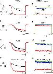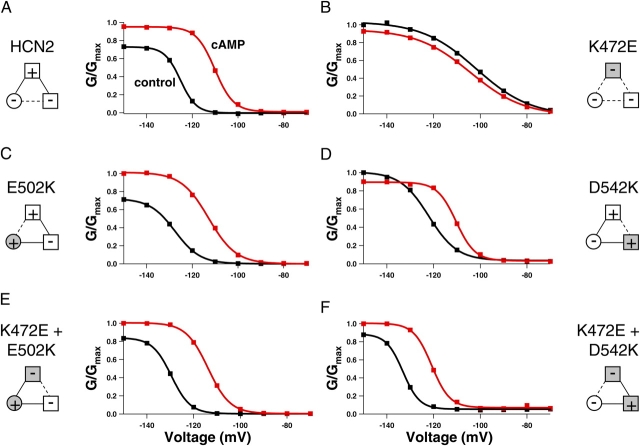 Figure 6. . Conductance–voltage relations for HCN2 channels. (A–F) Conductance versus voltage plots for wild-type HCN2 (A), K472E (B), E502K (C), D542K (D), K472E+E502K (E), and K472E+D542K (F). Each plot indicates GV curves, obtained from normalized tail currents at −40 mV, in the absence (black) and presence of saturating cAMP (red). The data are fit with a Boltzmann relation. Diagrams on the left and the right show attractive electrostatic interactions by solid lines and repulsive electrostatic interactions by a dotted line with wild-type residues as open symbols and mutant residues as shaded symbols. |