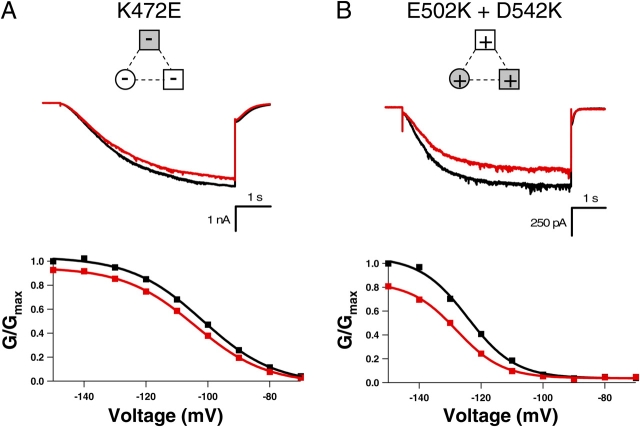 Figure 8. . Double negative-to-positive HCN2 mutant has same phenotype as B' helix site positive-to-negative mutant. Behavior of K472E (A) and E502K+D542K (B) HCN2 channels. Currents in response to voltage pulses to −130 mV, as well as conductance–voltage relations of the normalized conductance from tail currents at −40 mV, are shown in the absence (black) and presence of saturating cAMP (red). Diagrams at the top of each column show attractive electrostatic interactions by solid lines and repulsive electrostatic interactions by dotted lines with wild-type residues as open symbols and mutant residues as shaded symbols. The GV curves are fit with a Boltzmann relation. |