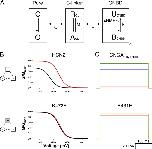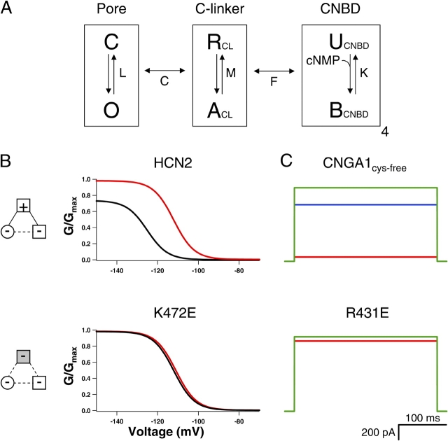 Figure 9. . Model of modular gating scheme for HCN and CNG channels. (A) HCN and CNG gating model with three modules: pore, C-linker, and CNBD. Each module is represented by a boxed equilibrium, indicating that each module can be in one of two configurations. Pore can be closed (C) or open (O), C-linker can be resting (R) or activated (A), and CNBD can be unbound (U) or bound (B) with ligand. Equilibrium constants are shown for each module: L for pore, M for C-linker, and K for CNBD. The pore and the C-linker influence each other through allosteric factor C, and the C-linker and CNBD through allosteric factor F. (B) Simulated conductance–voltage (GV) relations for wild-type (top) and K472E (bottom) HCN2 channels in the absence (black) and presence of saturating cAMP (red). A voltage-dependent module that was coupled to the pore was added for these calculations. The values of the parameters used are shown in the materials and methods. (C) Simulated current traces in response to voltages for CNGA1cys-free (top) and R431E (bottom) channels in the presence of saturating cAMP (red), cIMP (blue), and cGMP (green). For the R431E simulations, the current values for cIMP are so similar to cGMP that the two traces overlay. Diagrams to the left show attractive electrostatic interactions by solid lines and repulsive electrostatic interactions by dotted lines with wild-type residues as open symbols and mutant residues as shaded symbols. |