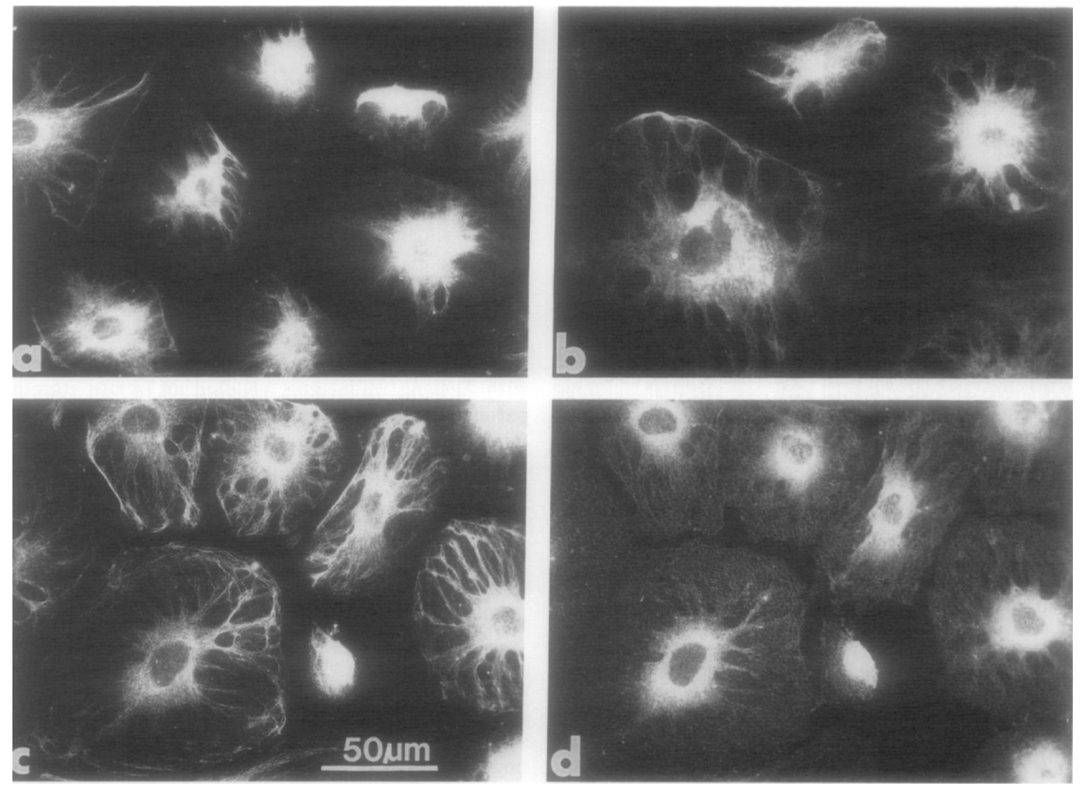 FIG. 3. Immunofluorescence labeling of fixed and permeabilized XRl cells. (A) R5 monoclonal antibody. (B) anti-vimentin. (C, D) Double-labeling