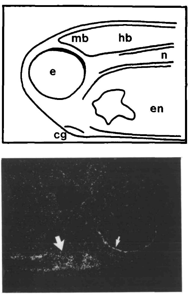 e, eye; en, endoderm; hb, hind brain; mb, mid brain;