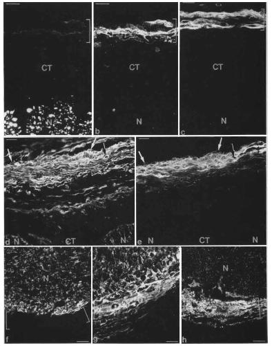 Fig. 3a-h. Immunofluorescence microscopy of frozen sections through the esophageal wall of Xenopus laeuis (for details see [W])u,s ing
