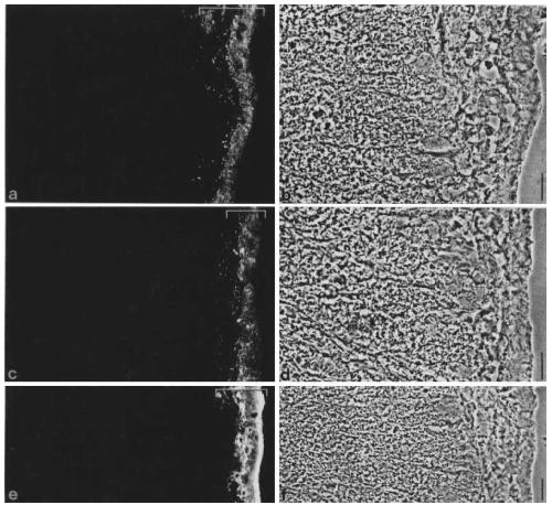 is shown in a, c, e, the corresponding phase-contrast photographs are shown in b, d, f. Bars, 20 pm |