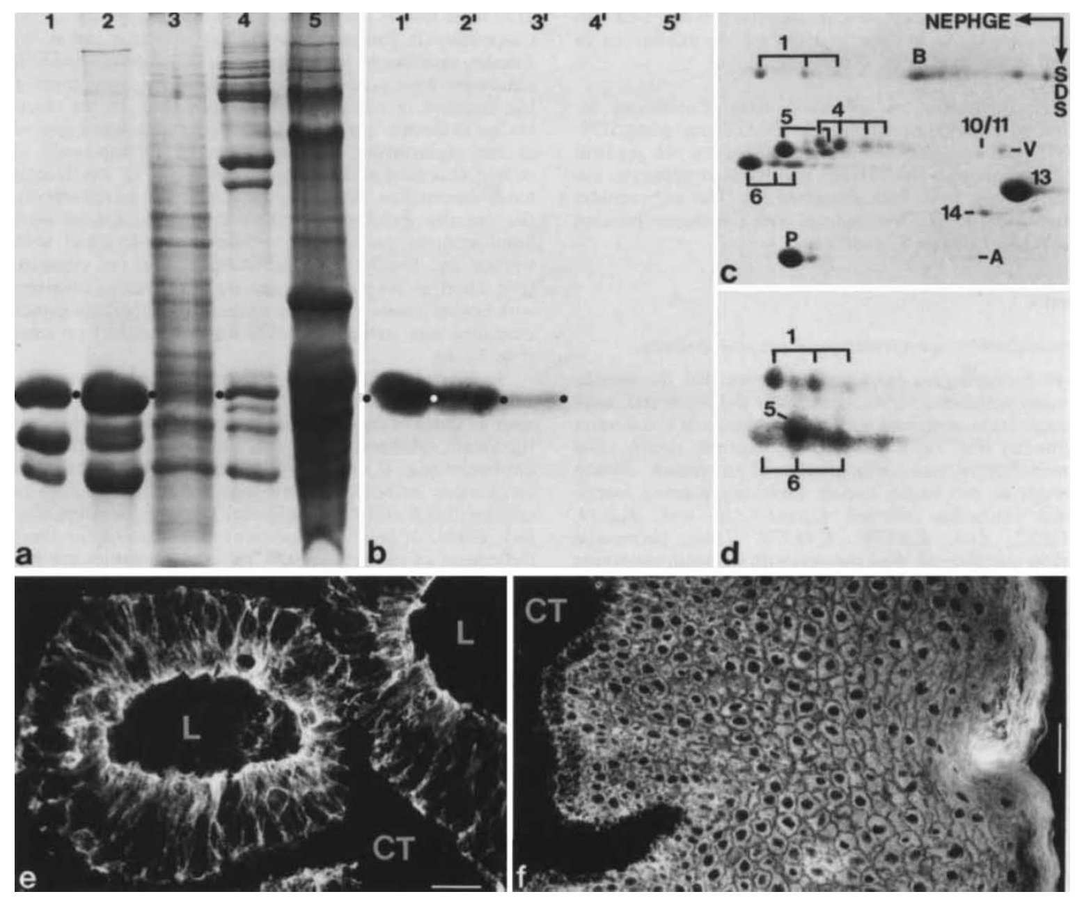 vimentin present in trace amounts from nonepithelial contaminations; A position of residual actin. d Autoradiograph showing immunoblot