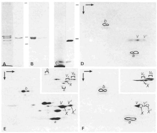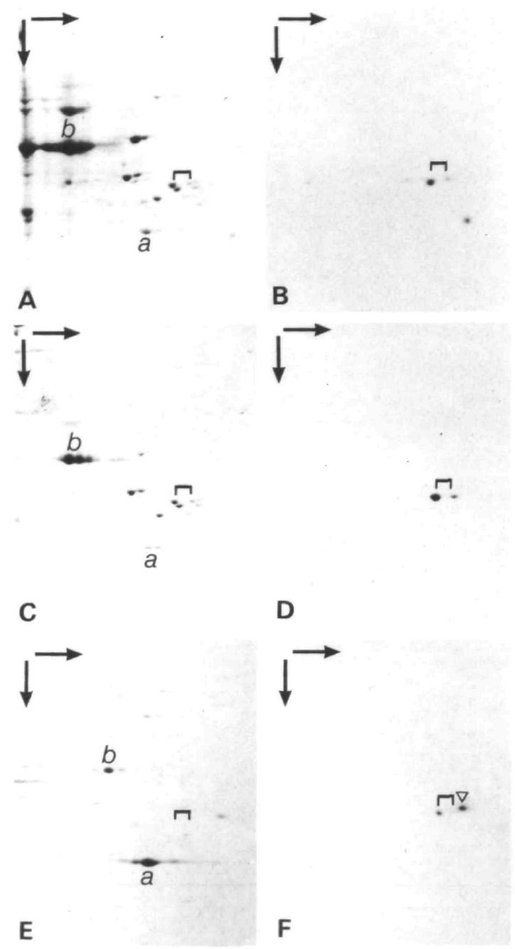 Fig. 3. Identification of the polypeptides encoded by the cDNA clones pXenViml and pXenVim4. Coelectrophoresis of the high-salt-buffer-resistant cytoskeletal proteins of XLKE-A6 cells (same system and symbols as in Fig. 2C,D) with products of in vitro translation from hybrid-selected embryonal stage-18 mRNA (A,B) and from mRNA obtained by in vitro transcription/translation of pXenViml (C,D). Coelectrophoresis of the mixed products obtained from in vitro transcription/translation of pXenViml and pXenVim4, respectively (E,F). (A,B) Coomassie-brilliantblue- stained gel (A) and corresponding autoradiograph (B), showing that the [ SJmethionine-labelled in vitro translation products from hybrid-selected mRNA comigrate with unlabelled vimentin (bracket) of XLKE-A6 cells. (C,D) Coomassie-brilliant-blue-stained gel (C) and corresponding autoradiograph (D) of the product obtained by in vitro transcription and translation, showing that the [ SJmethionine-labelled translation product comigrates with unlabelled vimentin (bracket) of XLKE-A6 cells. Note that some modification, probably phosphorylation, also takes place in the rabbit reticulocyte assay used for in vitro translation, resulting in the appearance of a minor, more acidic variant. (E,F) Coomassie-brilliant-blue-stained gel (E) and corresponding autoradiograph (F) of mixed in vitro transcription/translation products of Xenopus vimentin clones pXenViml and pXenVim4. As revealed from parallel gels of individual [35S]methionine-labelled translation products, pXenVim4 is translated into a polypeptide slightly more acidic and less mobile (triangle) than pXenViml (bracket). Fluorography was for 4h. After prolonged exposure acidic variants were also visible. |