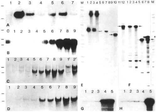 Fig. 7. Detection of vimentin-specific mRNA in various tissues and cells of adult animals and in embryonic stages of Xenopus laevis by RNA blot analysis (A-D) and RNase protection assays (E-H). (A) RNA was prepared from various tissues (Davis et al. 1986), and 20 //g total RNA (lanes 1, 4 and 5) or 1 fig poly(A)+RNA (lanes 2, 3, 6 and 7) were applied for formaldehyde/agarose gel electrophoresis. Hybridization was carried out with a random-primed, 32P-labelled (O-SxlO^tsmin"1 ml"1), 5'- end-specific probe of pXenViml. Lane 1, oesophagus; lane 2, XLKE-A6 cells; lane 3, skin; lane 4, skeletal muscle; lane 5, cardiac muscle; lane 6, liver; lane 7, ovary. Horizontal bars indicate the positions of Xenopus 28 S and 18 S rRNA. Exposure: 24 h. (B) RNA was prepared from ovary of adult frogs and embryos of the indicated developmental stages, 20 ^g total glyoxylated RNA were loaded per lane. RNA was blotted to Genescreen plus and hybridized with a 32P-labelled (3xl06ctsmin~1 ml"1) antisense RNA probe from pXenViml. The final washes were with 0-lxSSC, 0-5% SDS at 72°C. Lane 0, ovary; lane 1, unfertilized eggs; lane 2, stage 6-5 (morula); lane 3, stage 9 (fine cell blastula); lane 4, stage 11 (gastrula); lane 5, stage 14 (neural plate stage); lane 6, stage 18 (neural groove stage); lane 7, stage 28; lane 8, stage 39; lane 9, stage 42 (swimming tadpole). Horizontal bars indicate the positions of bovine 28 S, E. coli 23 S and bovine 18 S rRNAs. Exposure: 4h. Because of the higher activity of the riboprobe, the signal obtained for ovarian tissue appears enhanced, compared to that shown in A, lane 7). (C) RNA as loaded in B was run on a formaldehyde/agarose gel, blotted to nitrocellulose and hybridized with P-labelled probe as in B. The final washes were with 0-lxSSC, 0-1 % SDS at 65°C. Lane 1, unfertilized eggs; lane 2, stage 6-5; lane 3, stage 9; lane 4, stage 11; lane 5, stage 14; lane 6, stage 18; lane 7, stage 28; lane 8, stage 39; lane 9, stage 42. Horizontal bars indicate the positions of Xenopus 28S and 18S rRNA. Exposure: 5h. After 64 h exposure, the signals were considerably enhanced as shown in lanes 1' and 2' which correspond to lanes 1 and 2. Note the reaction with 18S and 28S rRNAs. (D) Blot shown in C after ribonuclease A treatment (20/igmn1 for 20min at 25°C followed by 65 °C washes with OlxSSC, 01 % SDS). Exposure: 10 days. Note that the signal at the position of the rRNA disappeared whereas that at the position of vimentin mRNA persisted (lanes 2-9). (E) Autoradiogram of a ribonuclease protection assay with 1 /ig sense RNA generated by in vitro transcription from pXenViml (lanes 10 and 12) and from the cytokeratin clone pXenCK 1/8 (lanes 9 and 11), showing that the sense RNA of pXenViml, but not that of pXenCKl/8, specifically protects the 32P-labelled anti-sense vimentin probes (arrows in lanes 10 and 12). Hybridizations shown here were carried out at 45°C (lanes 1, 2, 7 and 8) or 60°C (all other lanes) for 15h with lxlO5 ctsmin"1 (~lfmole) of the uniformly labelled 3'-specific probe (lanes 2, 4, 6, 8, 11 and 12) or the 'TYRKLEGE-probe' (see Materials and methods; lanes 1, 3, 5, 7, 9 and 10). To control for stringency, the probes were hybridized with 10 fig tRNA (lanes 1-8) and either subjected to RNAse treatment (lanes 5-8) or processed further without RNAse treatment (lanes 1-4). Lane M shows f/pall-restricted pBR 322 size markers (from top to bottom: 622, 527, 403, 309, 242, 238, 217, 201, 190, 180, 160, 147, 123, 110, 90 nucleotides). Exposure: lh. (F) Autoradiogram of a ribonuclease protection assay with 5 /Ig total Xenopus RNA from unfertilized eggs (odd numbers) and stage 18 (even numbers) using the 3'-specific probe (lanes 1-4) or the 'TYRKLEGE probe' (lanes 5-8). Hybridization was at 45°C (lanes 3, 4, 7 and 8) or 60°C (lanes 1, 2, 5 and 6). Arrows mark the fully protected probes without polylinker sequences. The arrowhead in lane 4 marks a prominent protected fragment of 160 nucleotides. Exposure: 3 days. (G) Autoradiogram of a ribonuclease protection assay with 5 /tg total RNA from oocytes (lane 1), unfertilized eggs (lane 2), stage-6-5 (lane 3), stage-18 (lane 4) and stage-28 embryos (lane 5) hybridized to the 3'-specific probe at 65°C. Exposure: 3 days. (H) Autoradiogram of a ribonuclease protection assay with 5/<g total RNA from oocytes (lane 1), unfertilized eggs (lane 2), stage-6-5 (lane 3), stage-9 (lane 4) and stage-28 embryos (lane 5) hybridized to the 3'-specific probe at 65°C in buffer containing only 50 % formamide as compared to 80% as used in panels E-G. Exposure: 3 days. |