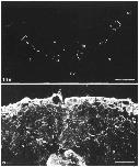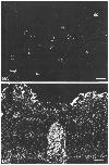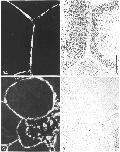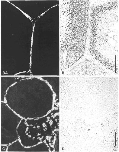 Fig. 8. Immunofiuorescence microscopy performed on cryostat sections of frozen ovarian tissue from Xenopus laevis using monoclonal antibody VIM-3B4. (A,B) The same field is shown in epifluorescence (A) and phase-contrast (B) optics. Note that only the interstitial cells show a bright fluorescence, whereas the oocytes are negative. (C,D) In a region with previtellogenic oocytes (C, epifluorescence; D, phase contrast) the oocytes are negative whereas the interstitial cells, the endothelial cells and the erythrocytes of the blood vessel show intense fluorescence, v, blood vessel. Bars. 50um. |