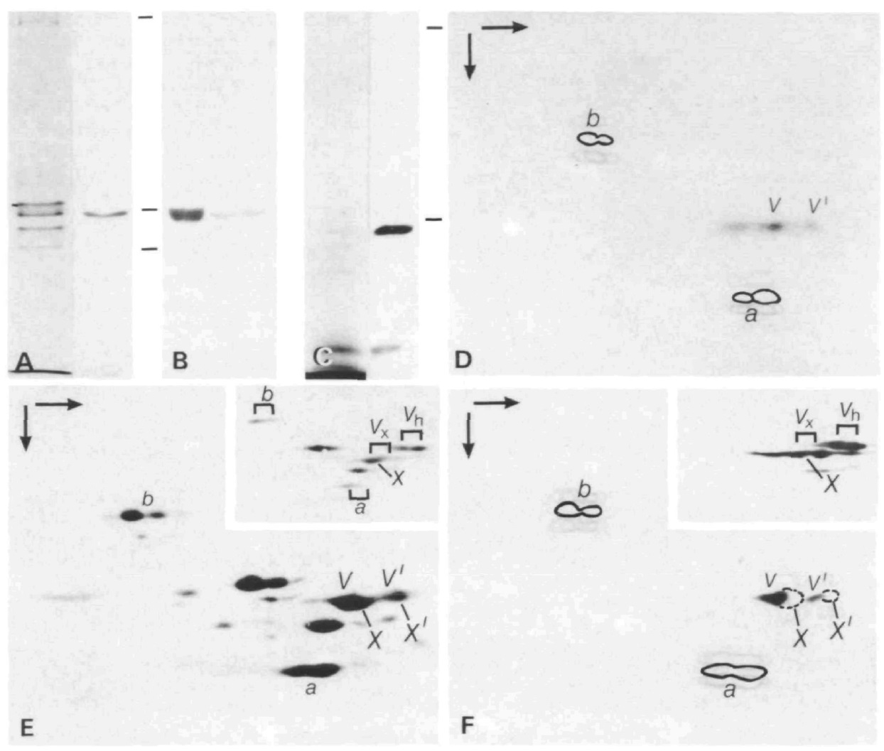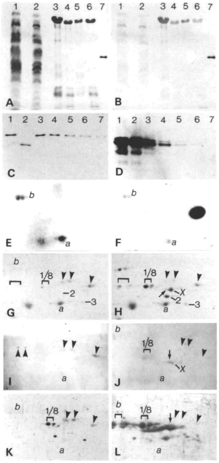 Fig. H- Analysis of various fractions from oocytes and unfertilized eggs of Xenopus laevis for the presence of vimentin by SDS-PAGE and immunoblotting with different antibodies. (A) Proteins transferred to nitrocellulose were stained by Ponceau S after the alkaline phosphatase immunostaining reaction shown in B. Lane 1, proteins recovered in the 100 000 g supernatant from total egg extracts (HSS proteins), concentrated by precipitation with acetone, 30-egg equivalents; lane 2, HSS proteins directly loaded, 12-egg equivalents; lane 3, high-salt-buffer-resistant « a fraction of the low-speed pellet from egg homogenates; lane " 4, insoluble fraction from high-salt-buffer-extracted material 1 2 3 4 5 6 7 1 2 3 4 5 6 7 pelleted at lOOOOg after an initial 800g centrifugation; lane 5, high-salt-buffer-resistant material pelleted at 800g; lane 6, high-salt-buffer-resistant material pelleted at lOOOOg. Lanes 3-6, 20-egg equivalents. The prominent high molecular weight band in lanes 3-6 contains the abundant major yolk protein. Lane 7, total cytoskeletal proteins of XLKE-A6 cells, 2 fig, representing approximately 0-2 ng vimentin (see Fig. 2A). (B) Immunoreaction corresponding to A, developed until background staining appeared, as shown by the unspecific reaction of the Mr â100000 yolk protein band (lanes 3-6) which was also seen when blots were only incubated with second antibody. Specific vimentin reaction is only seen in XLKE-A6 cells (lane 7). (C,D) Calibration of the sensitivity of antibody VIM-3B4 for the detection of Xenopus vimentin. (C) For quantification, Xenopus vimentin synthesized in E. coli transfected with clone pXenViml (cf. Magin et al. 1987) was dissolved in electrophoresis sample buffer, and a 10 uL sample was applied to the gel (lane 2). For comparison, bovine serum albumin was loaded as follows: lane 1, 1-4 fig; lane 3, l-2^g; lane 4, l^g; lane 5, 0-8jUg; lane 6, 0-6f«g; lane 7, 0-4//g. As estimated after staining with Coomassie brilliant blue, the applied amount of vimentin corresponded to approximately l^g of bovine serum albumin. (D) Immunoblot analysis of recombinant Xenopus vimentin diluted to various degrees: lane 1, l^g; lane 2, 500 ng; lane 3, 100 ng; lane 4, 50 ng; lane 5, 10 ng; lane 6, 5ng; lane 7, 1 ng. Note faint reaction in lane 6, showing that 5 ng are detectable. The band of somewhat higher SDS-PAGE mobility is proteolytically trimmed vimentin of Mr ~38000. Blots shown in B and D have been processed in parallel. (E,F) Examination of cytoskeletal fraction from unfertilized eggs with guinea pig antibodies to vimentin (E), in comparison with reference vimentin (F). (E) Autoradiogram of an immunoblot analysis of proteins from 15 unfertilized eggs separated by two-dimensional gel j - a l a electrophoresis, followed by incubation of nitrocellulose blots with guinea pig antibodies to vimentin and 125Ilabelled protein A. (F) Parallel experiment to that shown in E with cytoskeletal proteins from Chinese hamster ovary fibroblasts containing approximately l,ug vimentin. Both blots were exposed for 3 days at 70°C using intensifying screens. (G-L) Examination of the presence of vimentin in oocytes of Xenopus by two-dimensional gel electrophoresis, followed by immunoblotting. (G) Cytoskeletal proteins from 150 mg oocytes were separated by two-dimensional gel electrophoresis, transferred to nitrocellulose and stained with Ponceau S. The bracket denotes the major oocytes type II cytokeratin l/8, the three arrowheads denote a triplet of unidentified cytoskeletal proteins of Mr 56000-60000. Positions of cytokeratin 2 and 3, corresponding to human cytokeratin 18 and 19 and a group of basic cytokeratins of Mr â56000 are also indicated. (H) The same amount of protein as shown in G was mixed with cytoskeletal proteins from XLKE-A6 cells for the identification of the position of Xenopus vimentin (arrow) relative to the oocyte proteins. Symbols as in G. (I) Immunoblot analysis of cytoskeletal oocyte proteins with monoclonal antibody PK VI. Note absence of staining at the position of vimentin (arrows in H and J). Weak staining of five polypeptides of Mr 56000-60000 is indicated by arrowheads. (J) Immunoblot analysis of a mixture of cytoskeletal proteins from oocytes and XLKE-A6 cells with monoclonal antibody PK VI. Note staining of cytokeratin 1/8 and vimentin but not component X. (K) Immunoblot analysis of cytoskeletal oocyte proteins with antibody anti-IFA. Note staining of cytokeratin 1/8 but absence of staining at the position of vimentin. Note weak staining of triplet polypeptides of Mr 56000-60000. (L) Immunoblot analysis of a mixture of cytoskeletal proteins from oocytes and XLKE-A6 cells with anti-IFA. Vimentin as well as several cytokeratins are heavily stained, thus demonstrating that anti-IFA reacts with Xenopus vimentin. Comparison of L and K shows absence of detectable vimentin in K. |